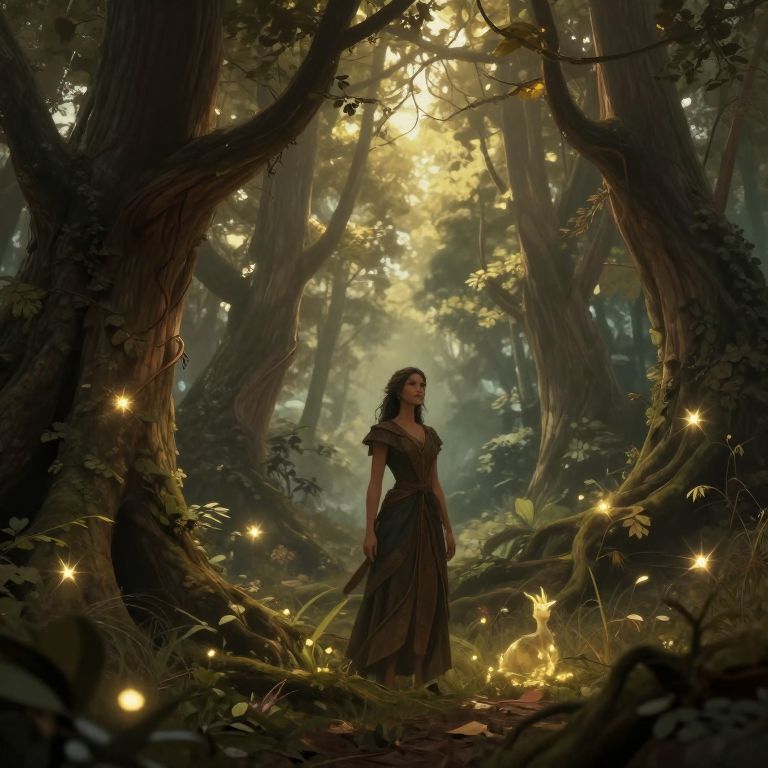 This digital fantasy artwork depicts a young woman with long, wavy brown hair standing in a mystical forest. She wears a dark, flowing dress with short sleeves, and stands amidst towering trees with thick, moss-covered trunks. Soft, golden light filters through the dense canopy, illuminating glowing fireflies that surround her. The forest floor is lush with green foliage, and the background fades into a misty, ethereal glow. The woman's serene expression and the enchanting, magical atmosphere create a sense of wonder and tranquility. The image has a realistic yet slightly whimsical style, with detailed textures in the trees and foliage.
