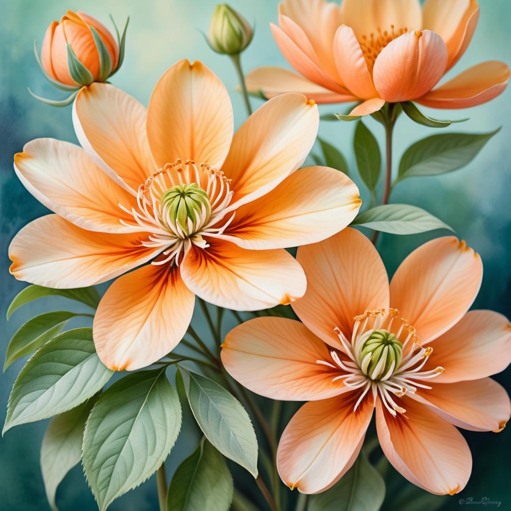 A close-up of large orange and peach watercolor flowers with delicate petals and detailed stamens, surrounded by soft green leaves and blurred blue background, vintage botanical painting style, warm and pastel colors