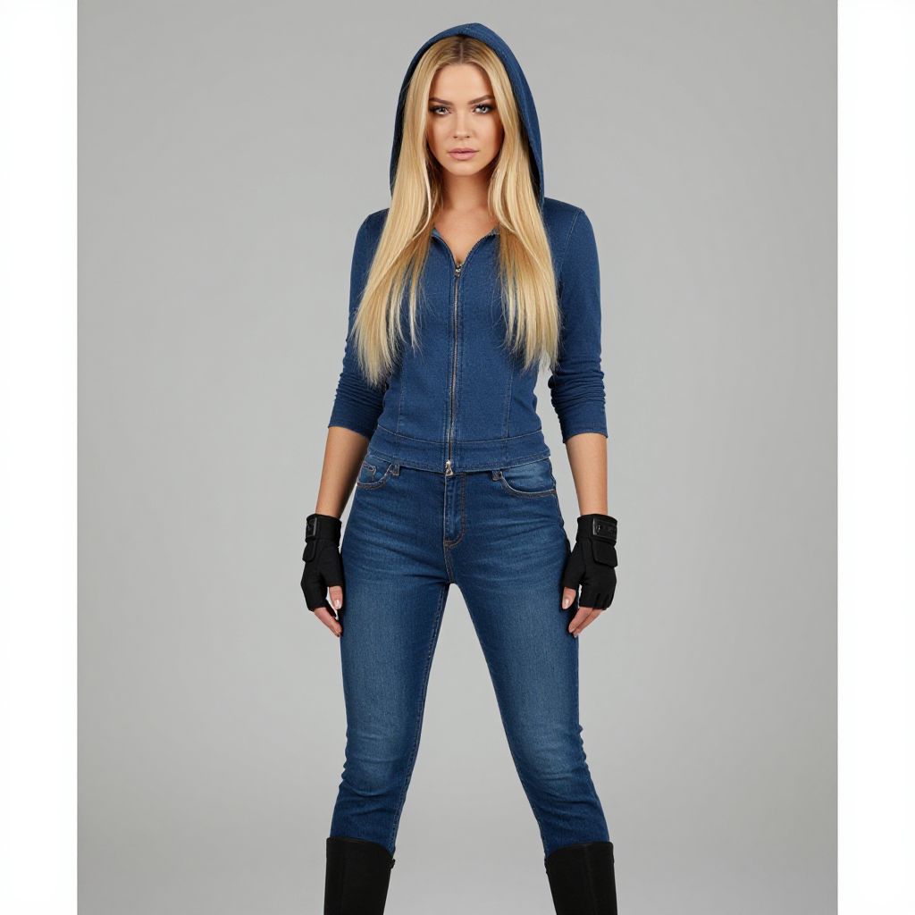 Photograph of a tall, slender, blonde Caucasian woman with long, straight hair, wearing a navy blue, zip-up hoodie with the hood up, over a matching navy blue denim jumpsuit. She has black fingerless gloves and black knee-high boots. Her expression is serious, with blue eyes looking directly at the camera. The background is a plain, light gray gradient, placing full focus on her. The image has a clean, modern style, with sharp, clear details and balanced lighting.