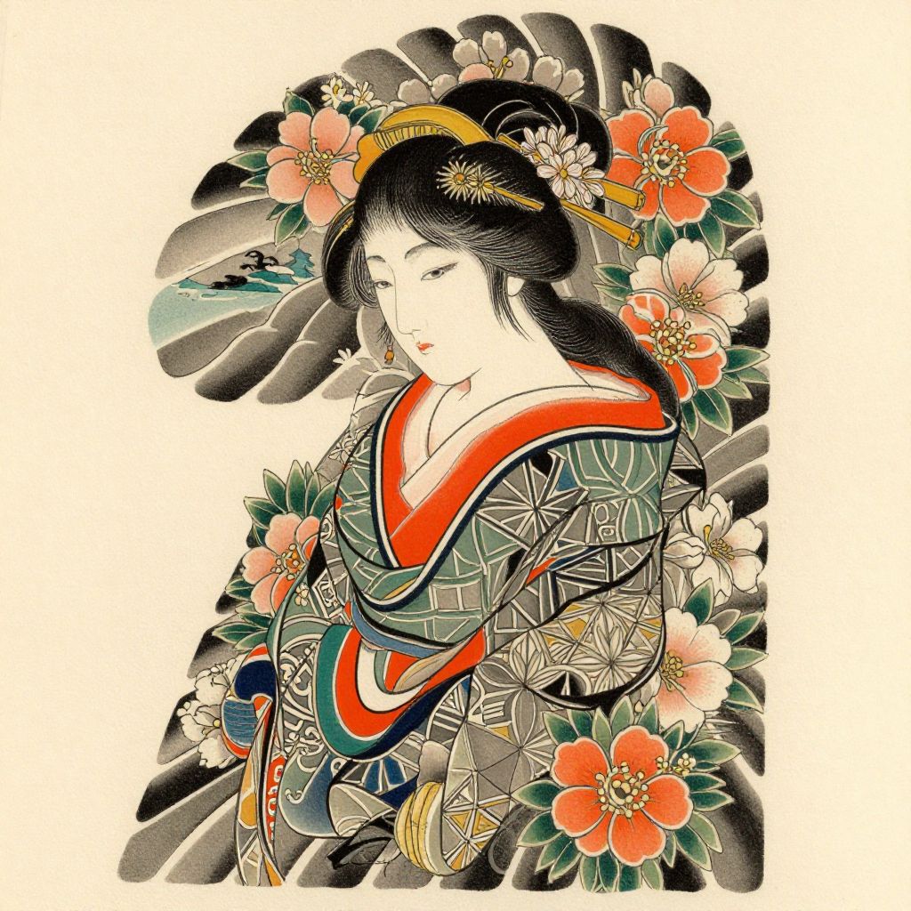 Traditional Japanese woodblock-style illustration of a serene woman in an ornate kimono, adorned with vibrant flowers and intricate patterns.