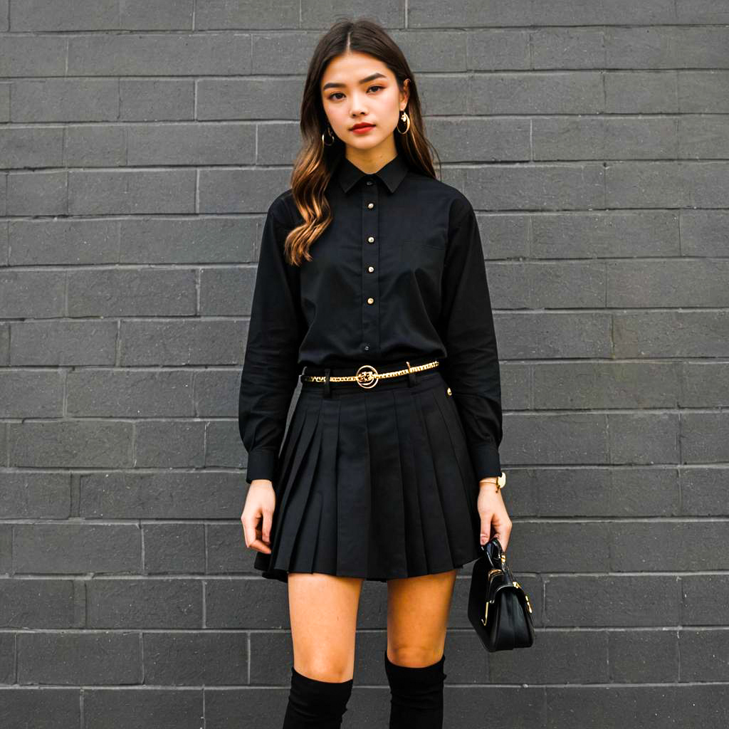 Stylish teenage girl wearing a black pleated skirt paired with a black tailored button-up shirt. The outfit is accessorized with a gold-accented belt, gold hoop earrings, and a black handbag with gold hardware. The teen has long wavy hair and stands against a gray brick wall background. The look is completed with black knee-high boots, emphasizing a modern and fashionable dark-hue ensemble with golden accents.