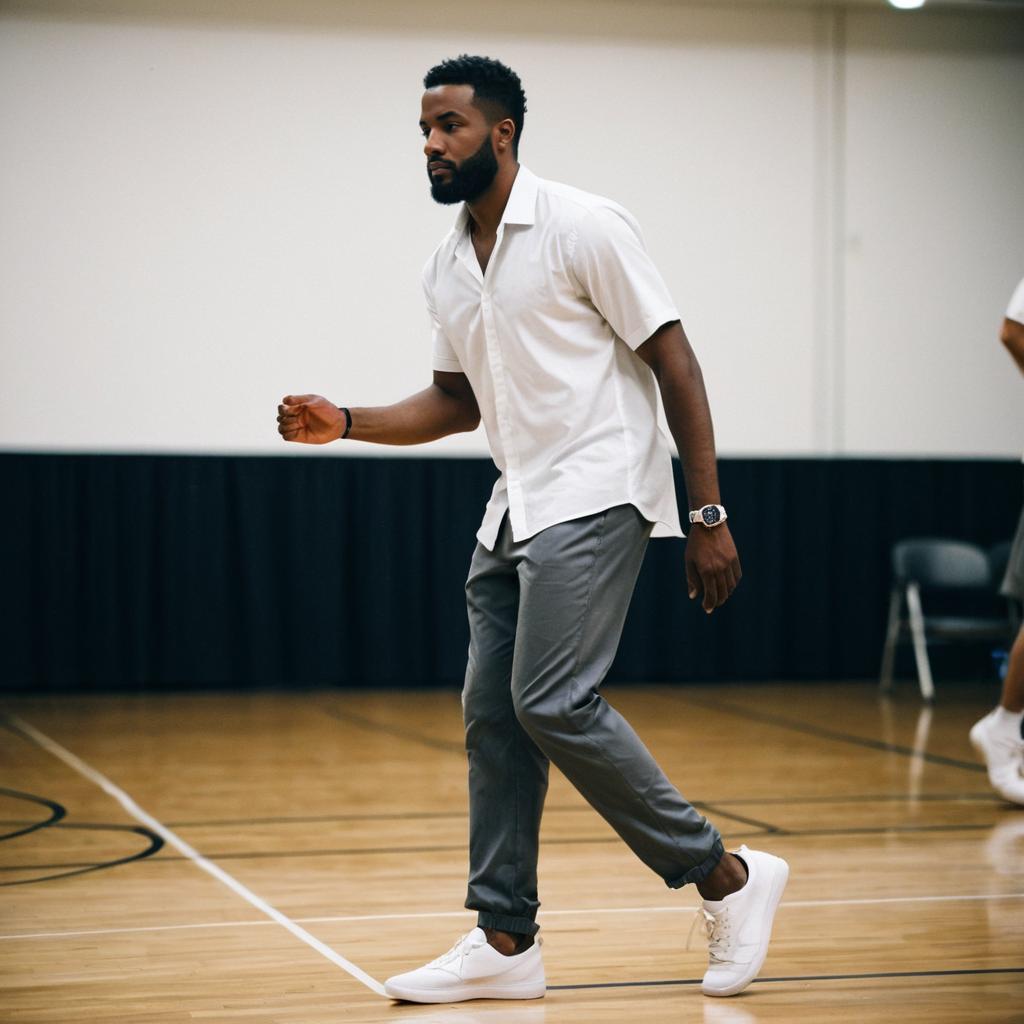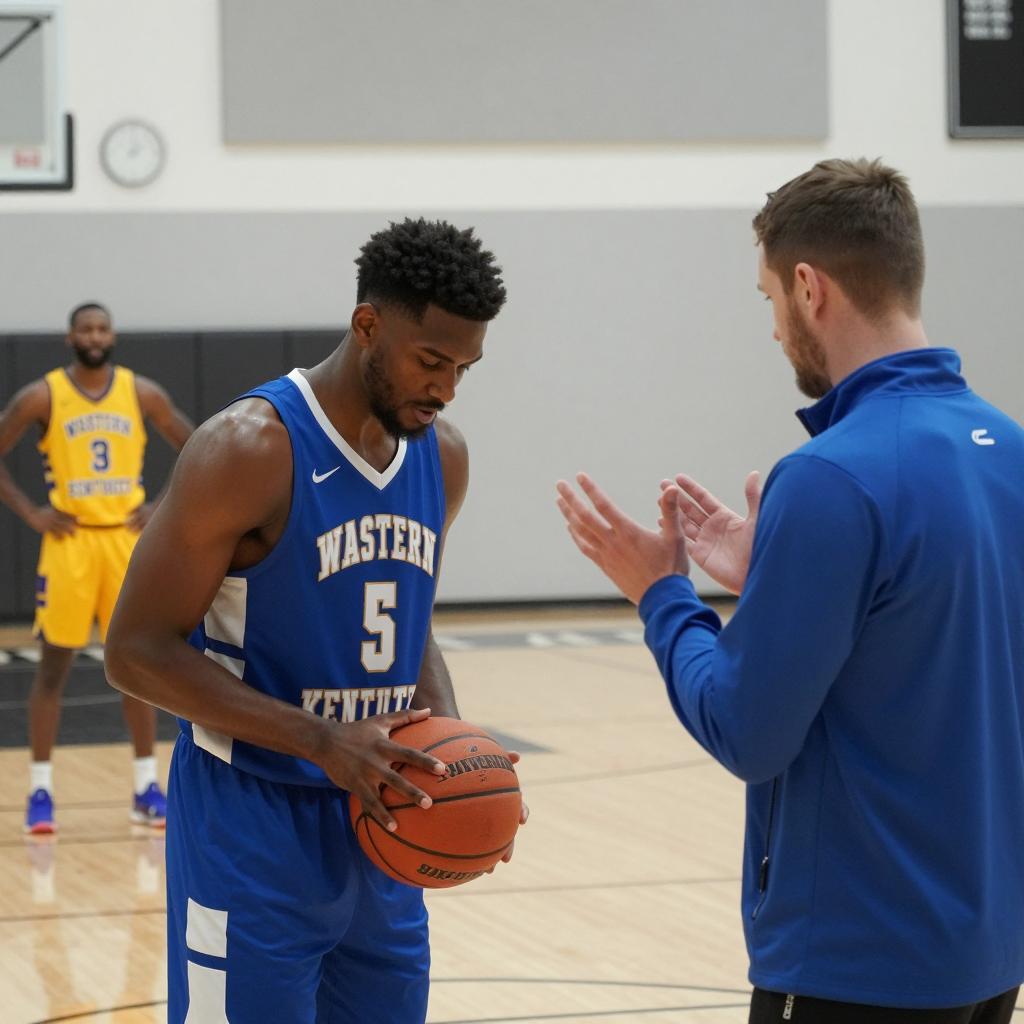 Photograph of an indoor basketball court. Two men in the foreground: muscular black man in a blue Western Kentucky University basketball jersey holding a basketball, looking down, and a white man with short brown hair in a blue jacket, hands raised in a pleading gesture. Background includes another man in a yellow basketball uniform standing near a wall with a clock.