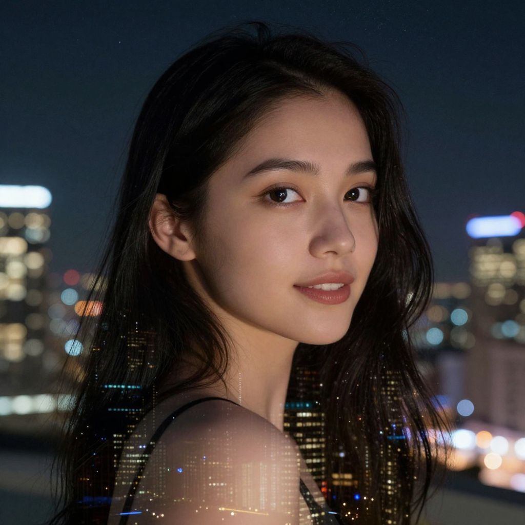 A captivating digital portrait showcases a young woman with porcelain skin and lush raven hair flowing down her back. Her enigmatic smile and gaze towards the horizon create an air of mystery as vibrant city lights merge with a starry night sky. The warm glow from the urban backdrop illuminates her delicate features, casting a soft radiance across her visage. In this double exposure, her eyes reflect both twinkling stars and distant skyscrapers, forming an illusory bridge between two realms. This portrait highlights the interplay of light and shadow, contrasting the softness of her expression with the sharp lines of the cityscape behind, creating a mesmerizing fusion.