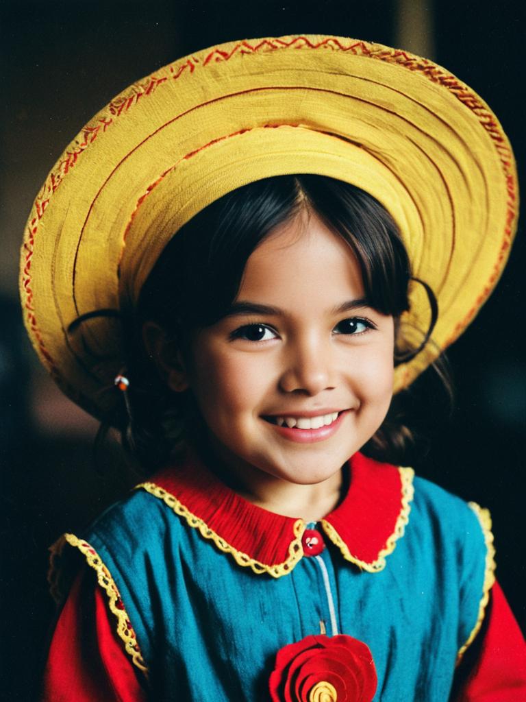 Child in Rosita Costume, cinematic realism, fun cheerful portrait