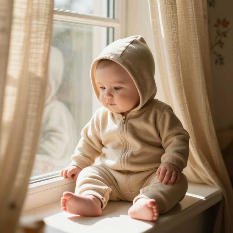 A baby with large, soft blue eyes, gentle and curious expression, is wearing a cozy beige outfit with a fluffy hooded jacket and a tiny knit hat, sitting on a warm, weathered wooden floor, looking up with quiet wonder. The scene takes place in a sunny, home-like indoor setting—bright and inviting with soft natural light filtering through a large window, casting gentle golden rays across the room. The background features a cozy, lived-in space with plush furniture, a small rug, and a few plants adding life and warmth, creating a serene and nurturing atmosphere.