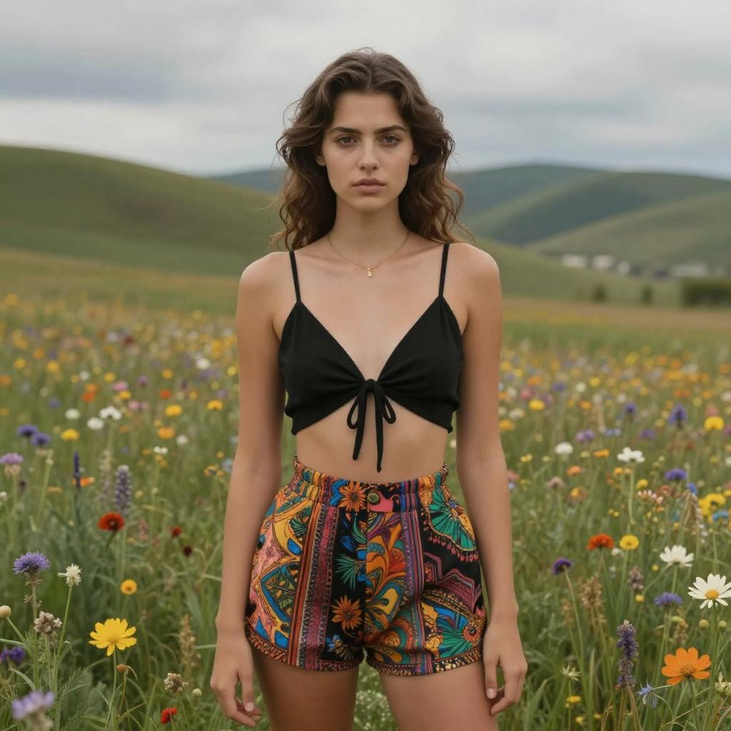 Photograph of a young woman standing in a vibrant meadow filled with colorful wildflowers. She has wavy, dark brown hair and fair skin, wearing a black, tied-front crop top that reveals her midriff, and high-waisted, colorful patterned shorts with intricate designs. She is looking directly at the camera with a neutral expression. The background features rolling green hills under a cloudy sky. She wears a delicate gold necklace. The image has a natural, slightly overcast light, enhancing the vivid colors of the flowers and her outfit.