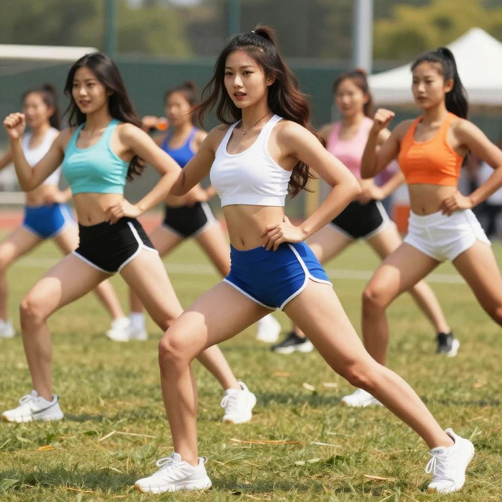 Sports babes in dynamic action poses on a sunny outdoor field, vibrant athletic wear, energetic and confident expressions, detailed musculature and motion blur, photorealistic style with bright, vivid colors and a lively background