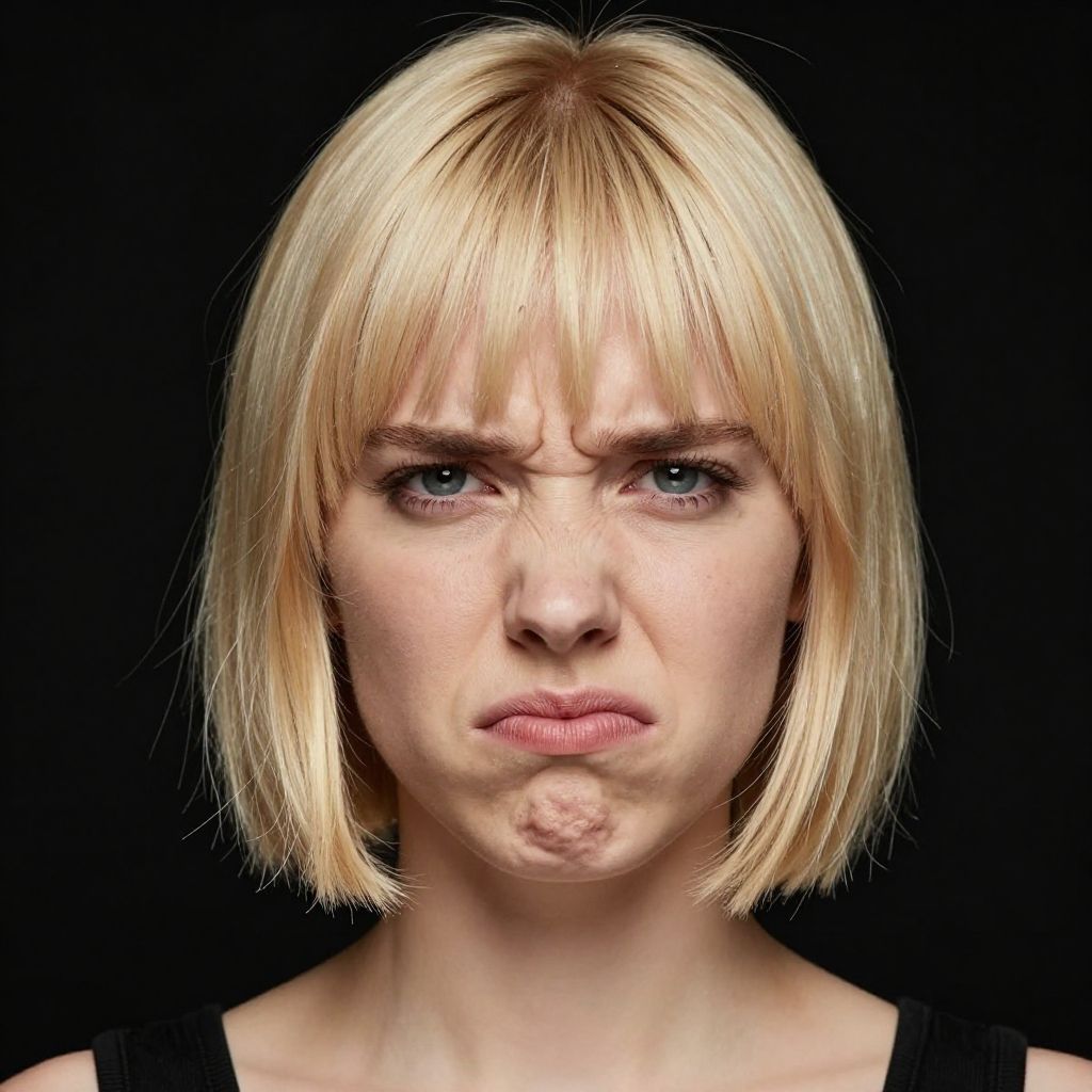 Disgusted face, 1girl, solo, blonde hair, black background, looking at viewer, simple background, short hair, portrait, parted lips, blunt bangs