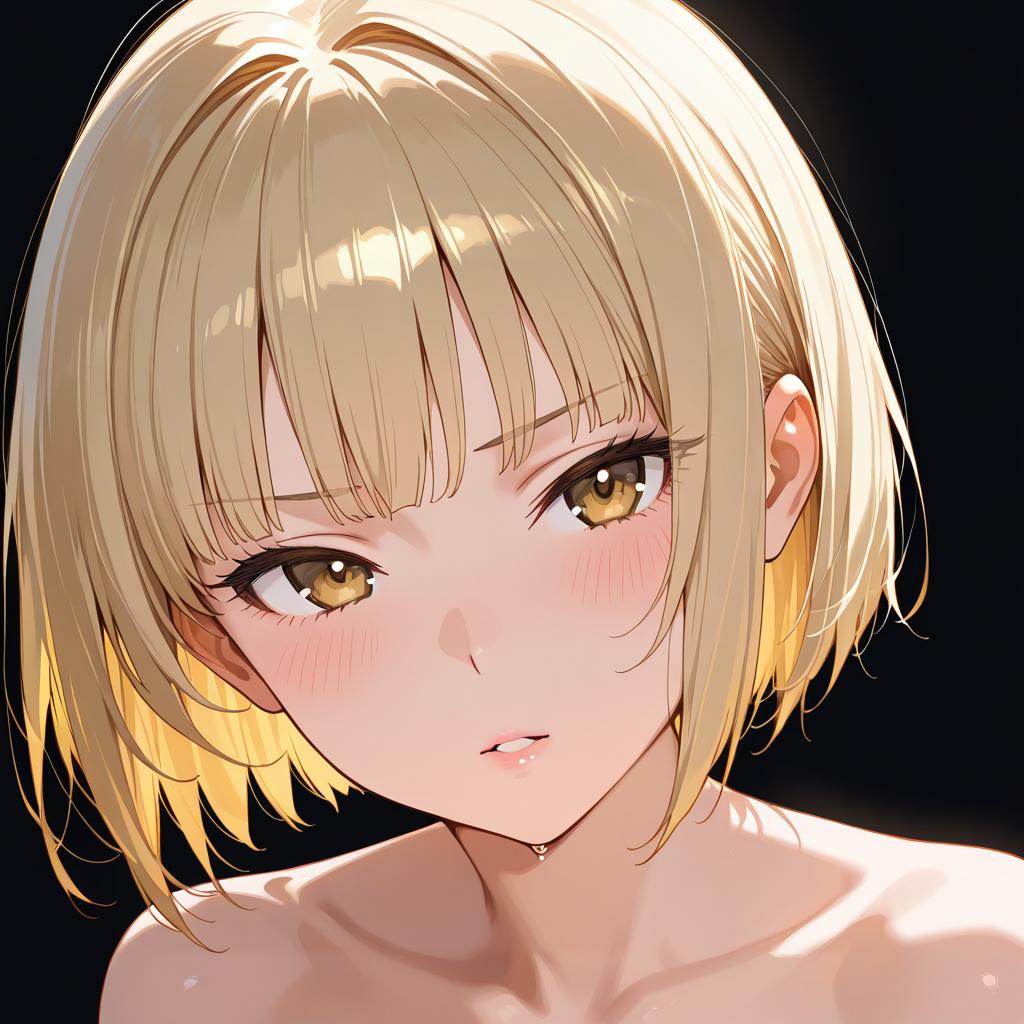 This is a digital anime-style portrait of a young woman with light blonde, shoulder-length hair and golden brown eyes. Her skin is fair with a slight blush on her cheeks. She has a neutral expression with a slight, almost pouty, pinkish lip. The lighting emphasizes the shine in her hair, casting a warm glow. Her shoulders are bare, suggesting she might be topless. The background is solid black, which makes her face stand out prominently. The artwork is detailed with soft shading and highlights, giving a semi-realistic yet distinctly anime aesthetic.