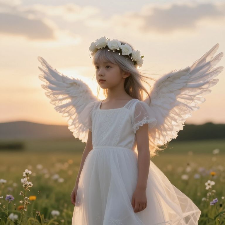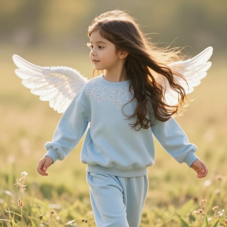A beautiful young girl with long, flowing brown hair that cascades down her back, glowing softly in the sunlight. She wears a light blue cotton sweatshirt with delicate, embroidered angel wings that gracefully extend from her shoulders, giving her a dreamy, ethereal look. She is dressed in matching light blue pants that accentuate her figure, and her expression is serene and joyful, as if she's floating in a peaceful, magical moment. The background is a softly lit meadow with warm golden hues, adding to the serene and enchanting atmosphere.