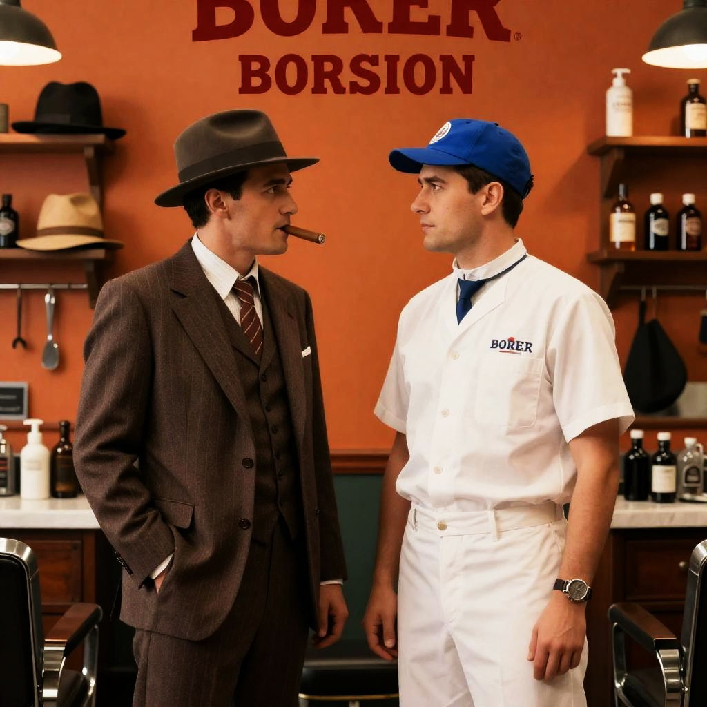 Photograph of a barbershop. A young man with slicked-back brown hair, wearing a white shirt and black suspenders, is adjusting a black tie in front of a mirror. Behind him, a poster of a cartoon character holding a gun and wearing a beanie is visible. The mirror reflects the same scene. The counter has various bottles, a spray bottle, and a red feather boa.