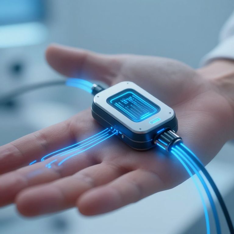 Hot prompt: A close-up of a neural interface device in a hand, pulsing with data streams, glowing blue lines, realistic futuristic design, subtle bioluminescence, sci-fi medical aesthetics, ultra-detailed rendering.