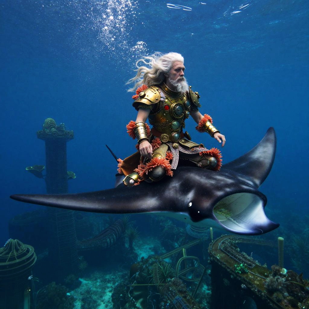 A ancient merfolk scholar wearing a ornate coral-and-brass steampunk robes while riding a enormous bioluminescent manta ray. Set against a lush luminescent underwater ruins background, this scene captures ultra-realistic detail and dynamic lighting, all rendered in stunning 48k quality.