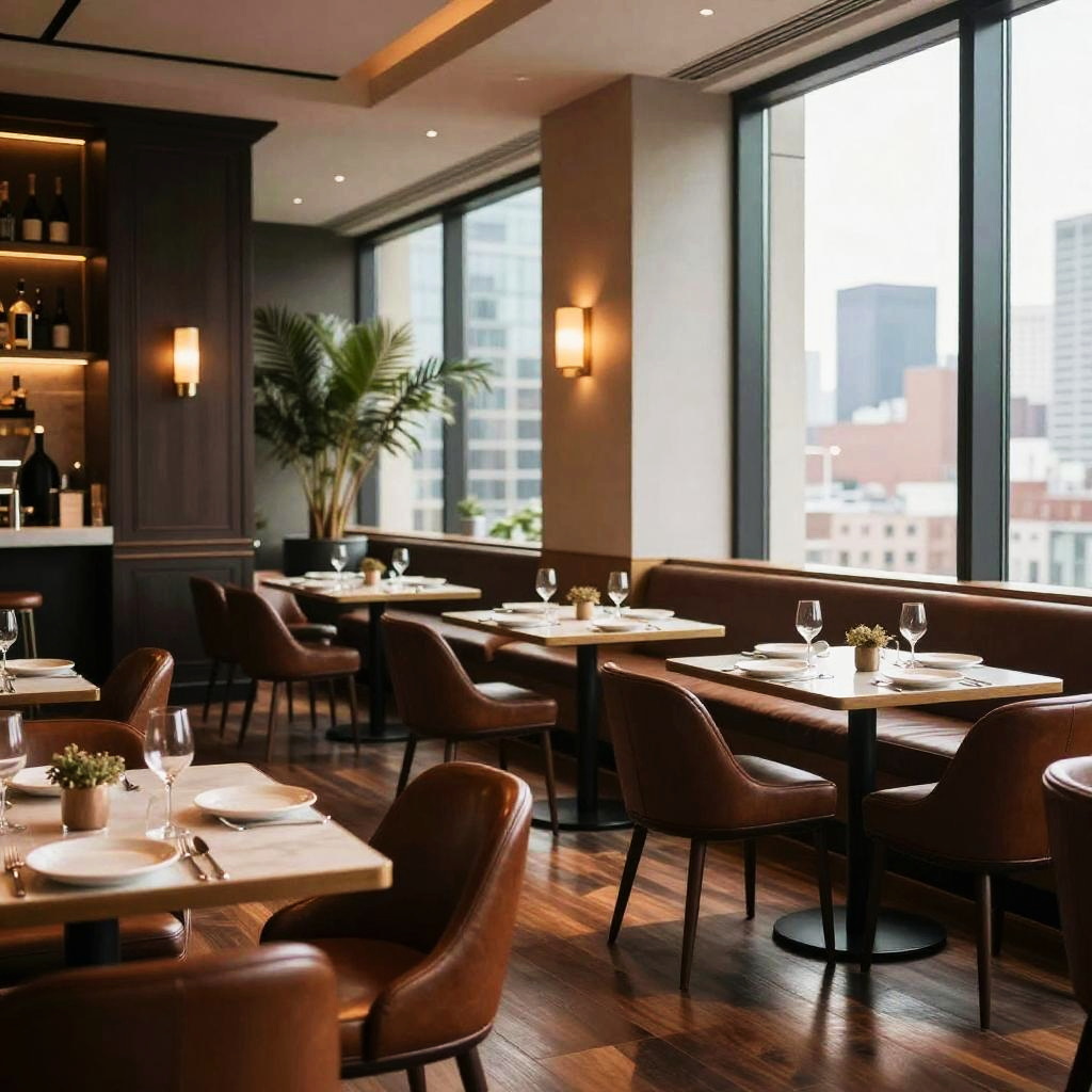 Photograph of a modern, upscale restaurant interior with large floor-to-ceiling windows letting in natural light. The room features dark wood floors and tables with brown leather chairs, each set with white plates and glassware. Warm, ambient lighting from wall sconces adds a cozy touch. In the background, a city skyline is visible through the windows. Potted plants add a touch of greenery.