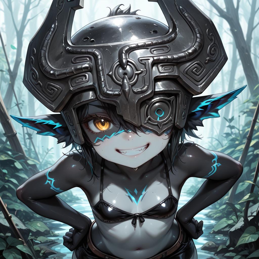 (masterpiece, best quality:1.2), solo, 1girl, midnaimp, grin, looking at viewer, hands on hips, helmet, colored sclera, yellow sclera, one eye covered