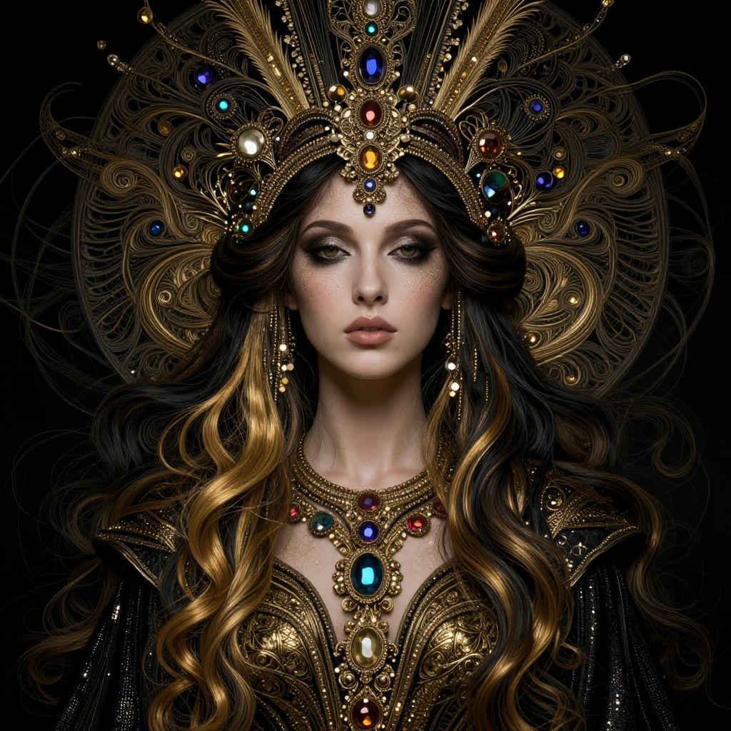 The image presents a striking and elaborate depiction of a female form, exuding a sense of luxury and elite status. The figure is adorned in an intricate ensemble of black, gold, and colorful elements, with a striking contrast against a dark background. The headpiece is a masterpiece of ornate design, featuring a combination of metallic and gemstone textures, with a central, intricate pattern that draws the eye. The long, flowing hair is a blend of dark and golden hues, cascading in a manner that enhances the regal and majestic aura of the figure. The face is flawless, with a serene expression, and is accentuated by delicate, glittering details that add a touch of ethereal beauty. The overall composition is hypermaximalist, with a focus on detailed textures and complex patterns, creating a sense of depth and richness. The image is reminiscent of the work of Ernst Haeckel and Charles Audubon, with its intricate, naturalistic elements and a cinematic quality that draws the viewer into the scene. The overall effect is both haunting and beautiful, with a sense of both elegance and creepiness that is both intriguing and captivating.