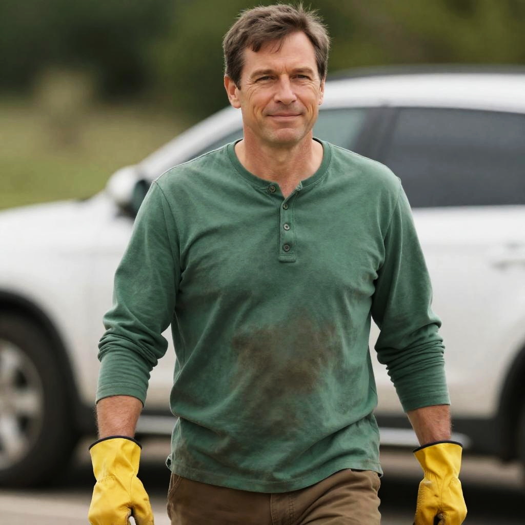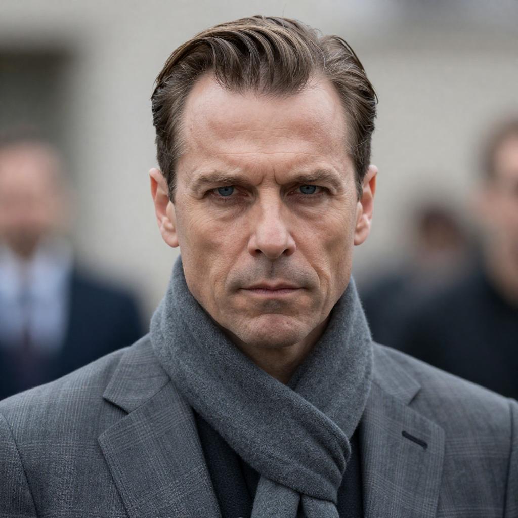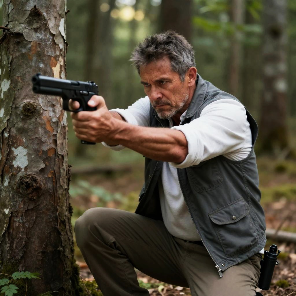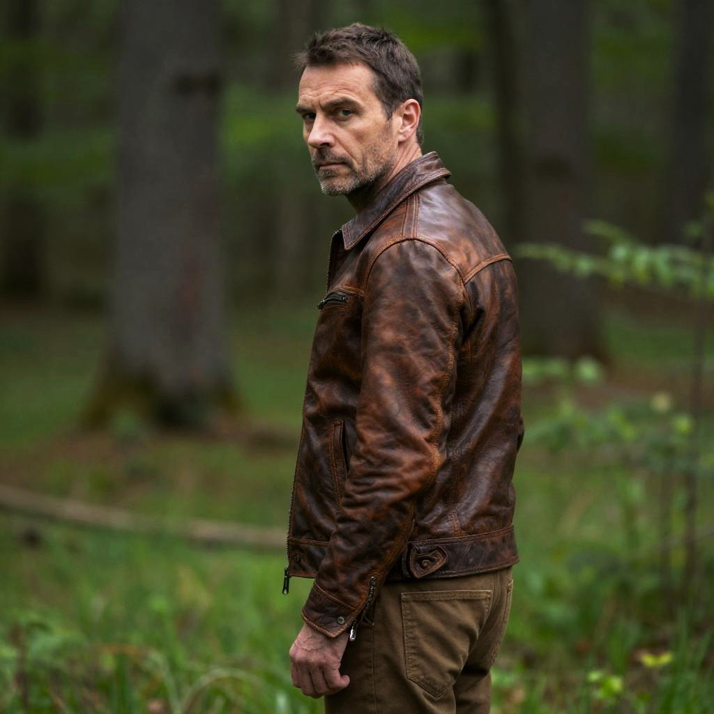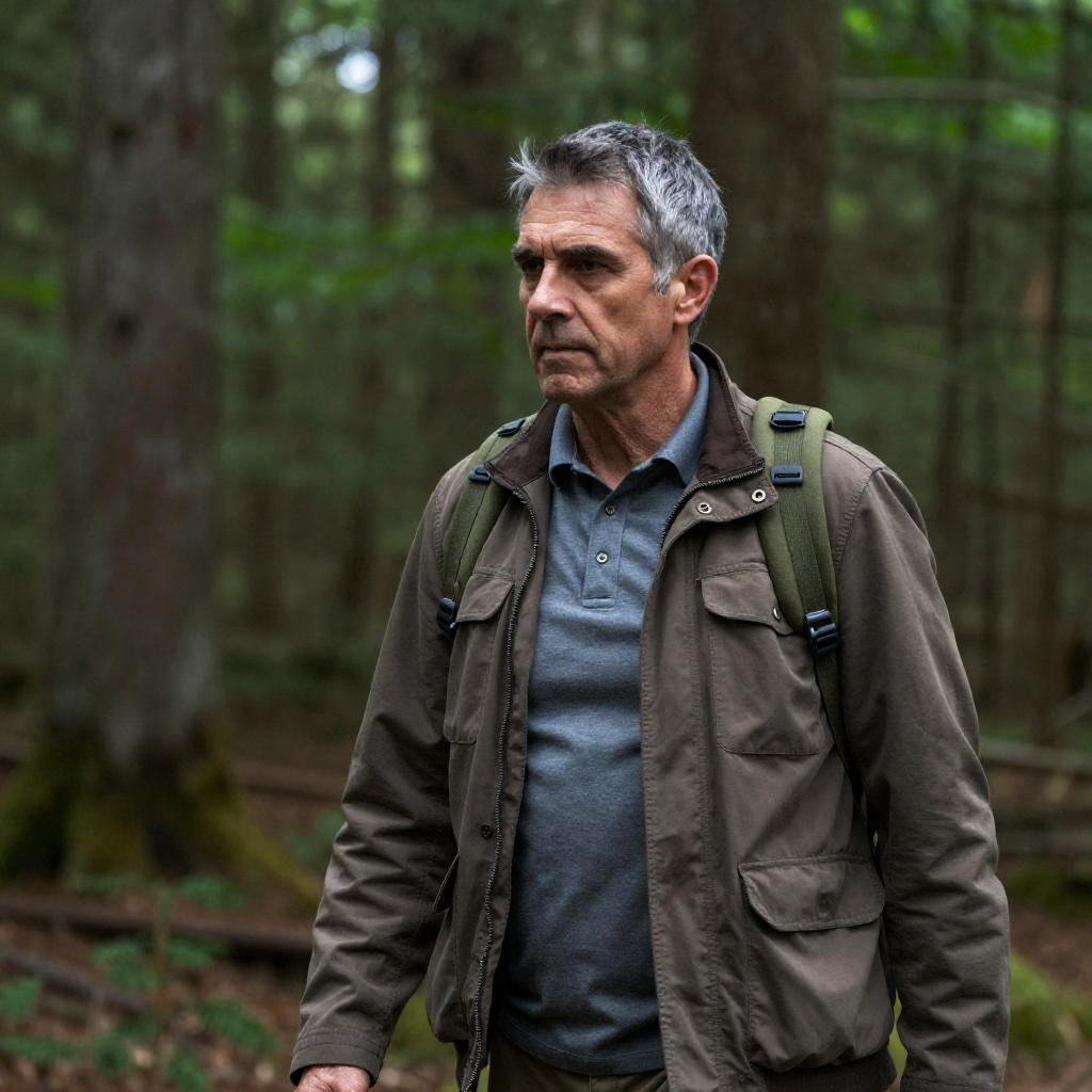 Middle-aged man with short, light brown hair, wearing a brown jacket, green backpack, and gray scarf, walking through a forest. He has a focused expression, looking to the side. Green foliage and tall grass in the background. Sunlight filters through trees. Man is slightly right of center.