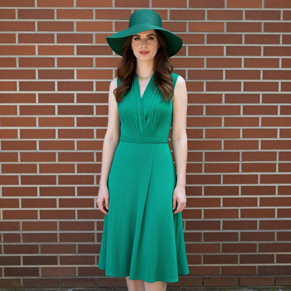 Photograph of a Caucasian woman with fair skin and long, wavy brown hair, standing against a red brick wall. She wears a sleeveless, emerald green dress with a pleated bodice and a knee-length, A-line skirt. She also sports a wide-brimmed, textured green hat. Her makeup is subtle, with red lipstick. A delicate necklace adorns her neck. Her arms rest naturally by her sides. The bright sunlight casts soft shadows on the brick wall, highlighting its texture. The overall style is modern and chic, with a focus on vibrant green and classic brick background.
