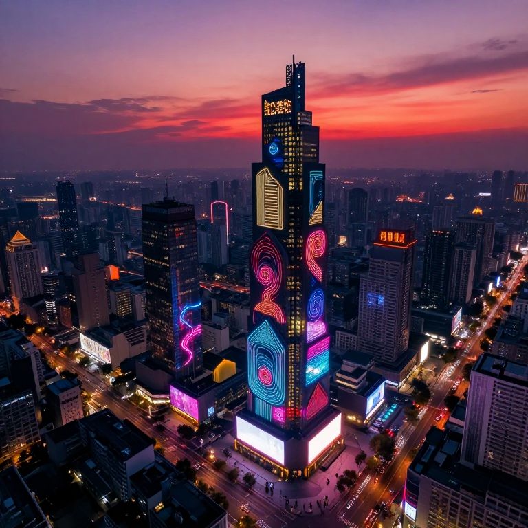 Envision an intricate futuristic cityscape at twilight, aglow with dynamic neon lights and holographic billboards. From an aerial perspective, we witness the lively urban tapestry where towering structures feature complex fractal designs, evoking a sense of Escher-esque mathematical intricacy. As the sun sets, the sky transitions into a captivating fusion of warm reds and deep purples, elongating shadows across the cityscape. This enthralling scene embodies the interplay between order and disorder, as geometric accuracy intertwines with the organic rhythm of life in this avant-garde metropolis.