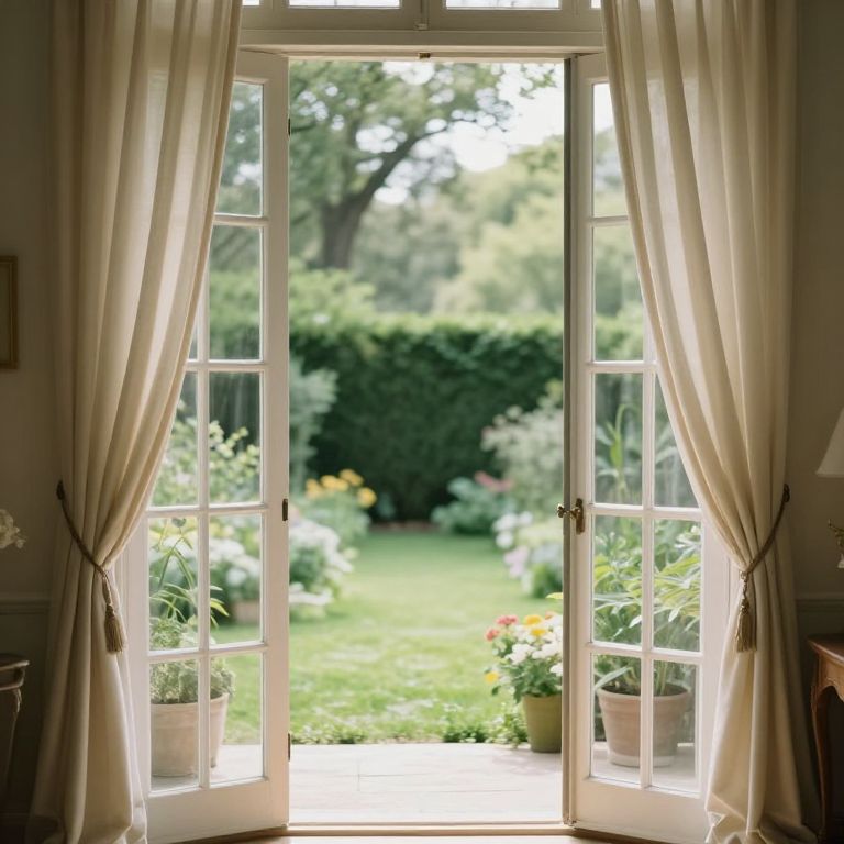 Photograph of a sunlit garden viewed through an open French door with sheer cream curtains tied back with gold tassels. The door, with white wooden frames and glass panes, reveals a lush, green garden in the background. Potted plants with various flowers, including red and yellow blooms, are placed on either side of the door. The garden features a well-maintained lawn, a tall hedge, and a tree with green foliage. The indoor setting has subtle, warm lighting, and the overall mood is serene and inviting.