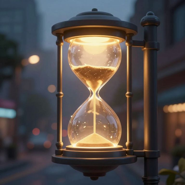 A cyberpunk-inspired 3D render depicts a streetlamp crafted from stacked hourglasses, glowing with a warm, golden light that symbolizes the passage of time, set against a moody, atmospheric dusk scene with blurred bokeh lights in the background.