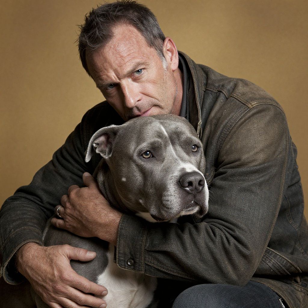 Intimate portrait of a rugged man embracing his loyal blue-grey pitbull companion, bathed in warm, golden studio lighting, emphasizing their deep connection and trust. The subject's weathered face, rugged hands, and worn clothing convey a sense of authenticity, while the dog's gentle gaze radiates affection. Soft focus highlights the texture of their fur, Man has masculine face and piercing eyes