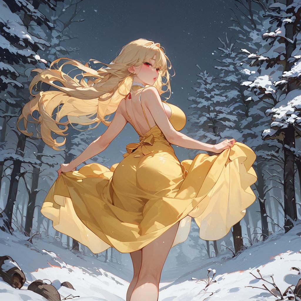 Digital artwork of a blonde woman with long hair and red eyes wearing a yellow sundress, standing in a snowy forest at night. The scene captures the contrast between the bright dress and the dark, snow-covered trees under a night sky. The woman is seen from behind, looking back over her shoulder with parted lips.