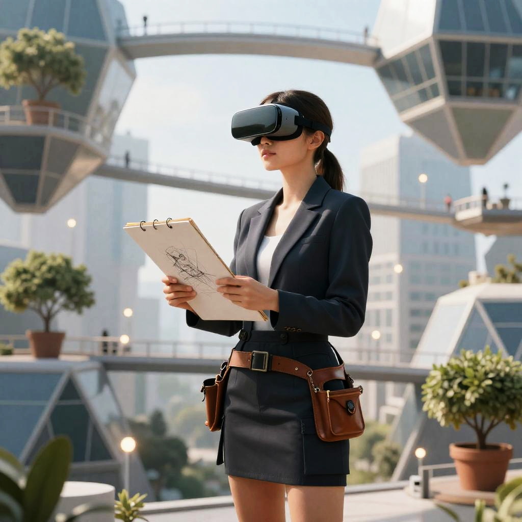 Create a captivating artwork featuring an elegant mature woman designer wearing a classy long gown, set against a backdrop of majestic stone pillars in a whimsical architecture scene, all rendered in meticulous detail.