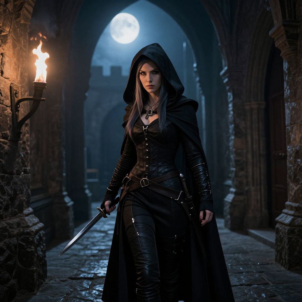 Digital artwork of a mysterious, dark-haired woman in a black hooded cloak, holding a dagger, standing in a dimly lit, Gothic archway