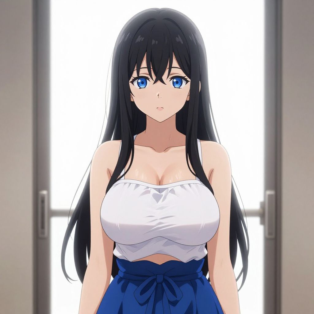 Digital anime-style drawing of a young woman with long, straight black hair and striking blue eyes. She has a fair skin tone and is wearing a white strapless top that accentuates her large breasts, and a blue high-waisted skirt with a large bow at the front. She stands against a bright white background with a blurred doorframe behind her. Her expression is neutral, with a slight blush on her cheeks. The image has a clean, modern anime art style with sharp lines and vibrant colors.