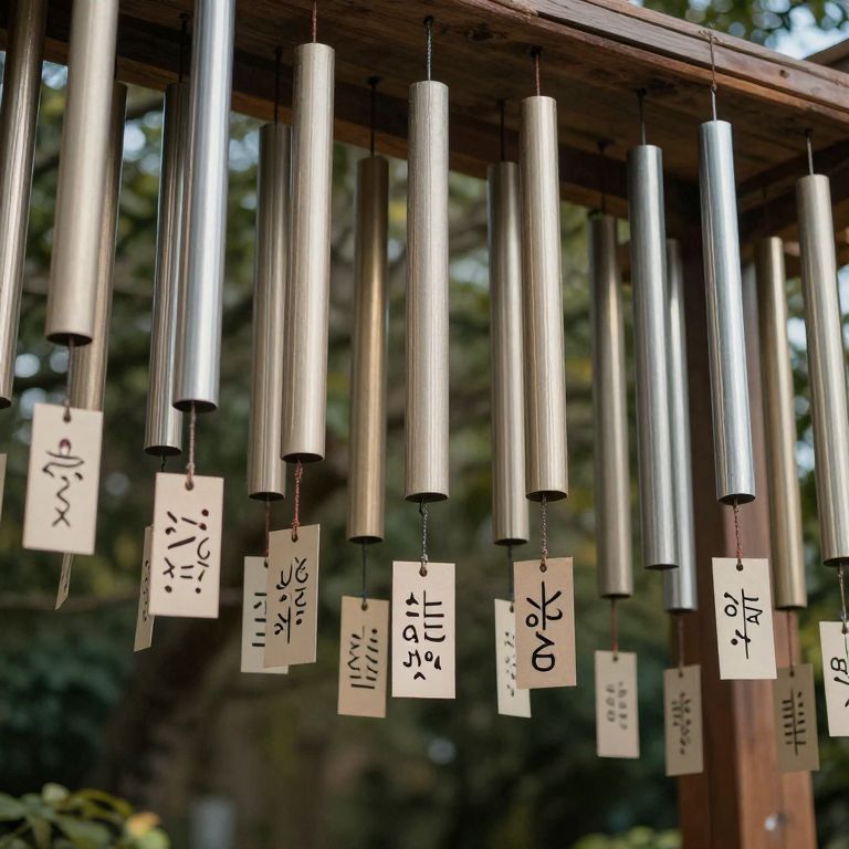 Voices trapped in wind chimes form a choir singing Earth’s forgotten languages in perfect harmony, visible as floating glyphs.