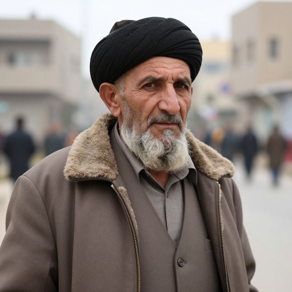 Photograph of an elderly Middle Eastern man with a weathered face and white beard, wearing a black turban and a brown coat with a fur-lined collar. He is standing in an urban street with a blurred background of people and buildings. The man has deep wrinkles and a gentle smile, and his expression is calm and wise. The coat has a slightly textured fabric, and the turban is neatly wrapped. The background is out of focus, highlighting the man as the main subject. The lighting is natural, suggesting an overcast day.