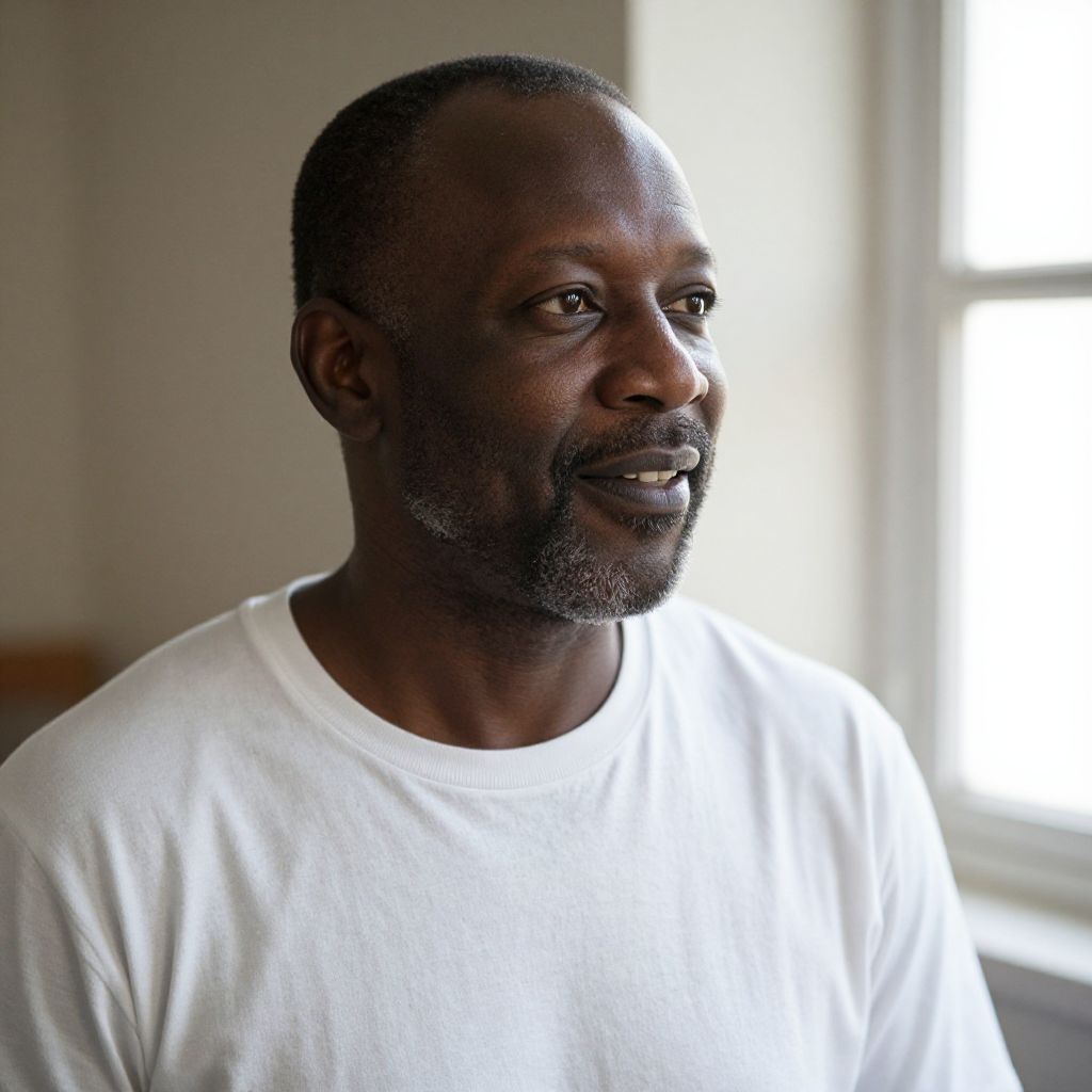 Photograph of a middle-aged, dark-skinned Black man with a short beard, wearing a white T-shirt, smiling gently in soft light.