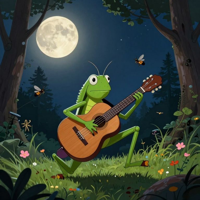 Under the watchful glow of the full moon, a grasshopper-guitarist weaves a nocturnal symphony, its vibrant strumming resonating with the whispers of the forest, where freedom hums in every chord and the ephemeral dance of insects mirrors the transient beauty of life.