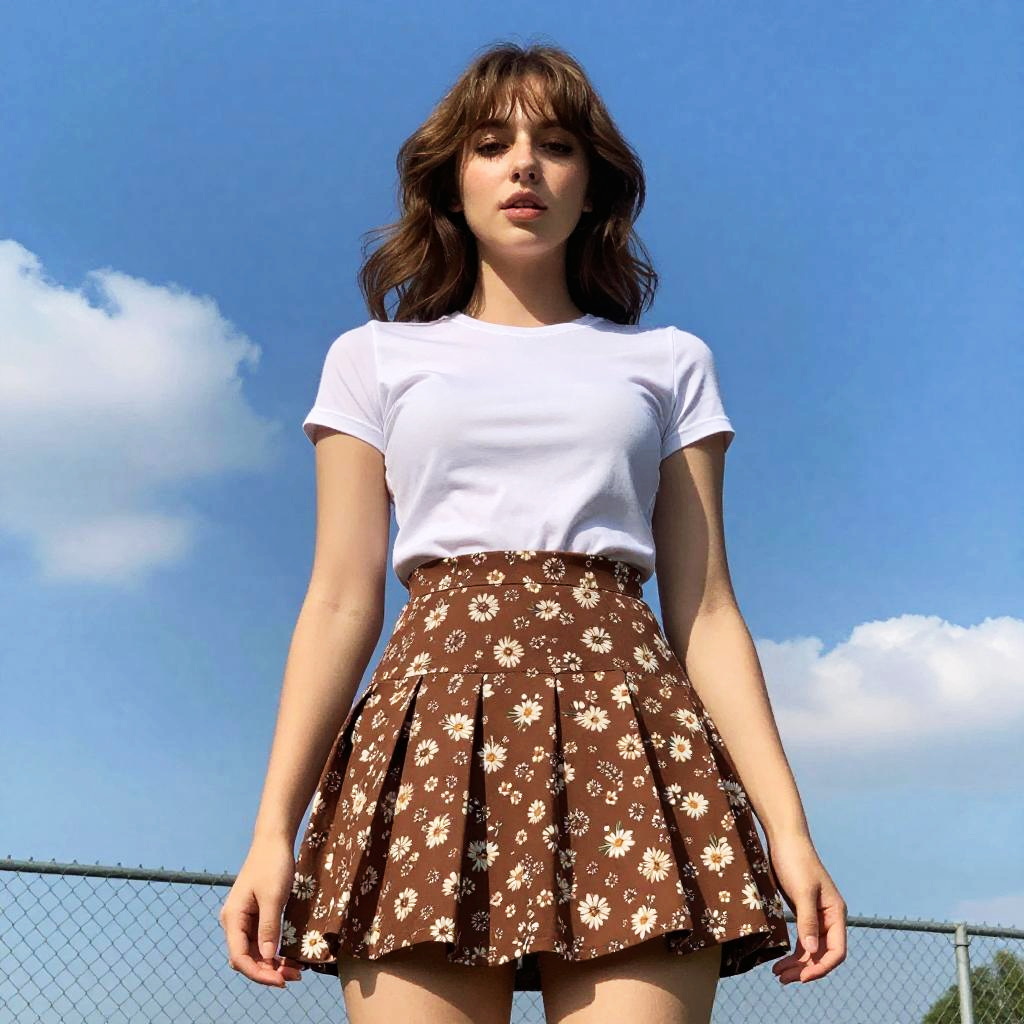 Photograph of a young woman standing outdoors, taken from a low angle. She has light brown, wavy hair with bangs, and is wearing a white, tight-fitting t-shirt and a brown, floral-patterned, pleated mini-skirt. The sky is bright blue with a few white clouds in the background, and there's a chain-link fence behind her. She looks down at the camera with a slightly open mouth expression.