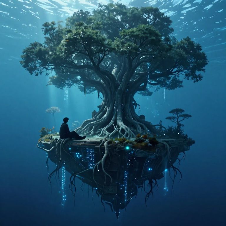 This digital art piece depicts a massive, ethereal tree floating in a deep, blue underwater environment. The tree has a thick, twisting trunk with roots extending downward, glowing with blue bioluminescent lights. At its base, a solitary, silhouetted figure sits on a small, floating platform. The platform is adorned with small plants and more glowing lights. Sunlight filters through the water from above, casting a mystical glow. The background features faint, luminous particles and distant, smaller trees. The overall scene exudes a surreal, fantasy-like atmosphere, blending elements of nature and sci-fi.