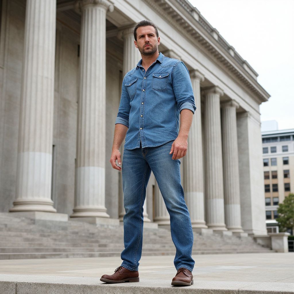 A man wearing a blue denim shirt and jeans with brown shoes, standing in front of a building with columns. The man has a confident posture, with a slightly rugged appearance, and his eyes are focused forward. The building with columns is classical in design, with a grand and imposing presence in the background. The scene is set in a city environment, with a mix of modern and historical architecture in the background.