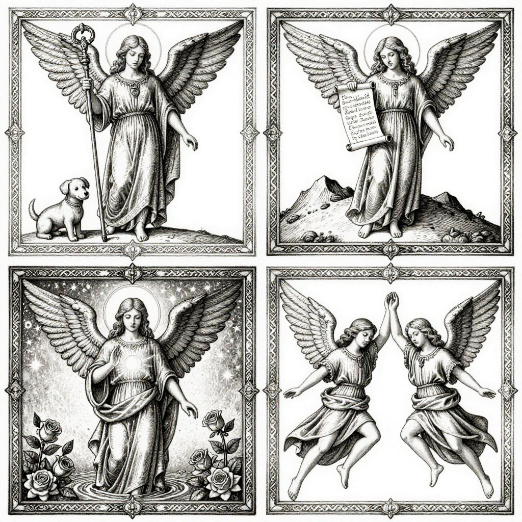 Black and white illustration of four winged angel figures in classical robes, each in a different pose, holding a scroll or standing with a dog, framed