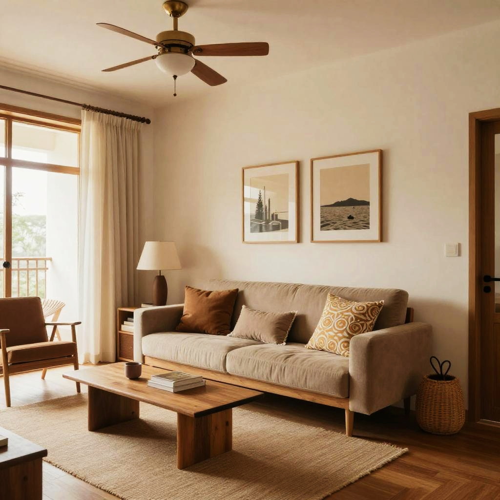 Retro Japandi interior design blending 70s vintage aesthetics with minimalist Japanese and Scandinavian elements, warm earth tones, natural wood textures, soft ambient lighting