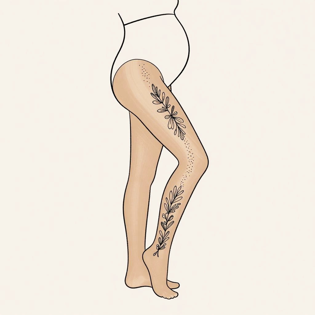 Pregnant pantyhose fashion illustration, elegant line art of pregnant woman in chic pantyhose with floral design, minimalistic style, soft color palette, graceful and modern