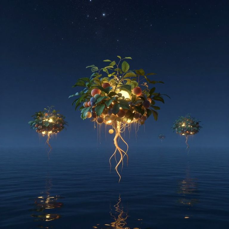Digital artwork of glowing, floating fruit trees with roots submerged in a calm, starlit ocean, illuminated by soft yellow lights.