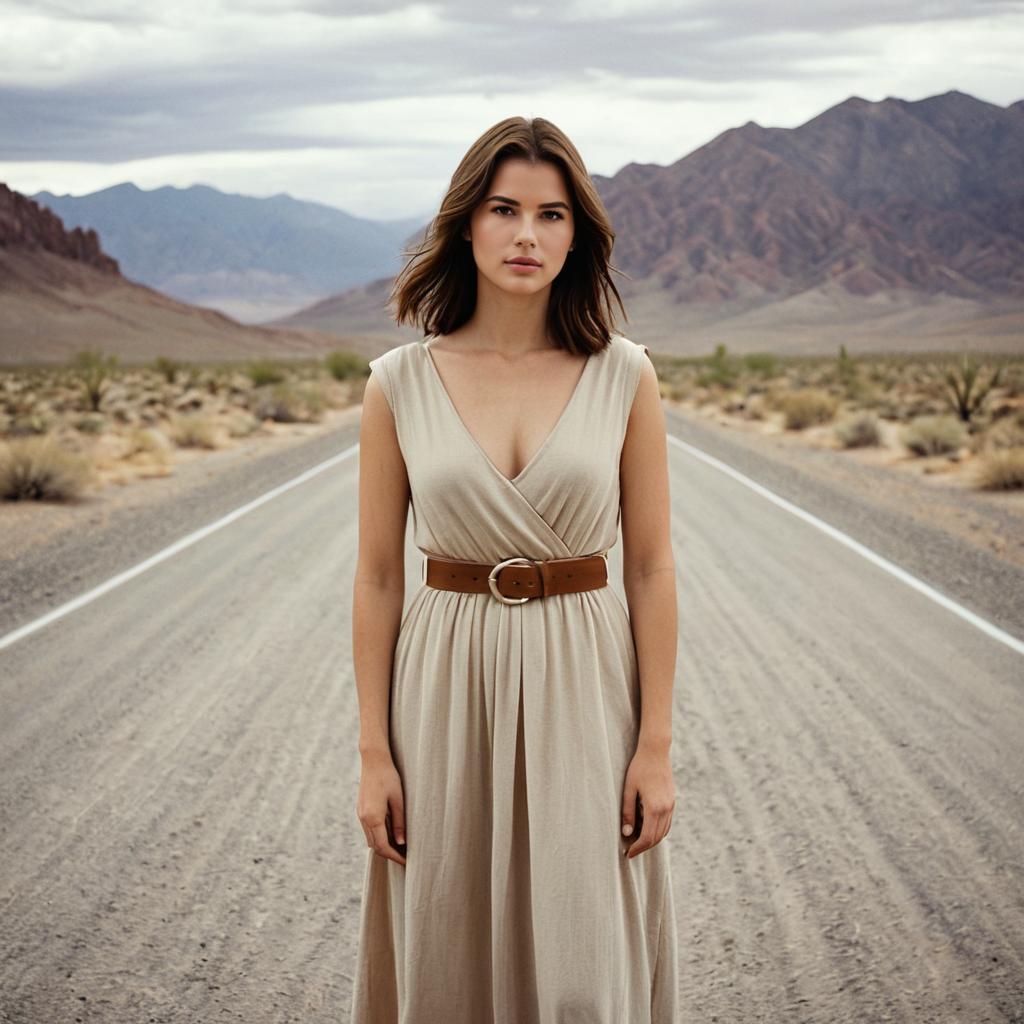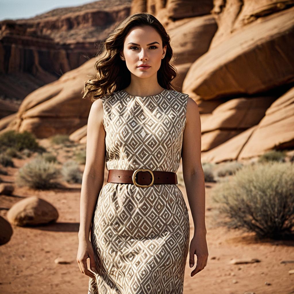 Indiana jones female cosplay, photorealistic, female adventurer, standing in rocky canyon, tan wide-brimmed hat, loose beige expedition dress with rolled sleeves, brown belt with large buckle, holding a gun, wavy brown hair, serious expression, natural light, rocks and vegetation in background, mid-20s, realistic ures, detailed clothing, outdoor setting, rugged terrain, cinematic style, movie still, film-like quality