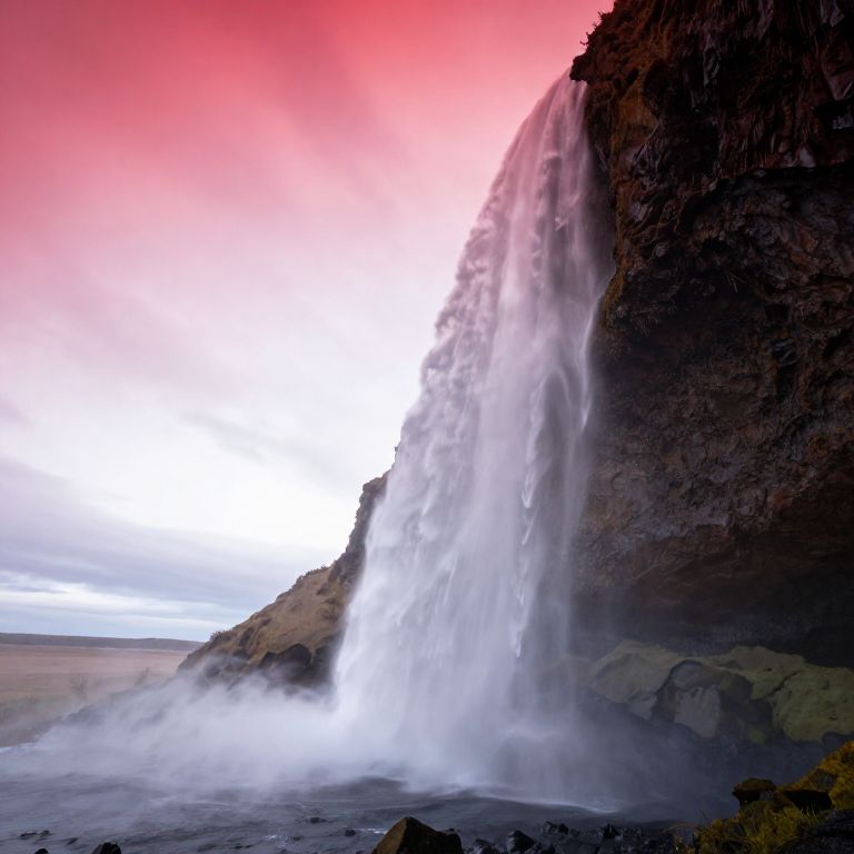 Photograph of a powerful waterfall cascading down a dark, rocky cliff into a misty, black sand beach. The background features a dramatic sky with a gradient from bright white at the horizon to intense pink and red at the top, creating a surreal atmosphere. The water appears white and frothy as it plunges into the sand, with mist rising around the base. The cliff's texture is rugged and jagged, contrasting with the smooth, flowing water. The image captures the natural beauty and raw power of the waterfall in a striking, otherworldly scene.