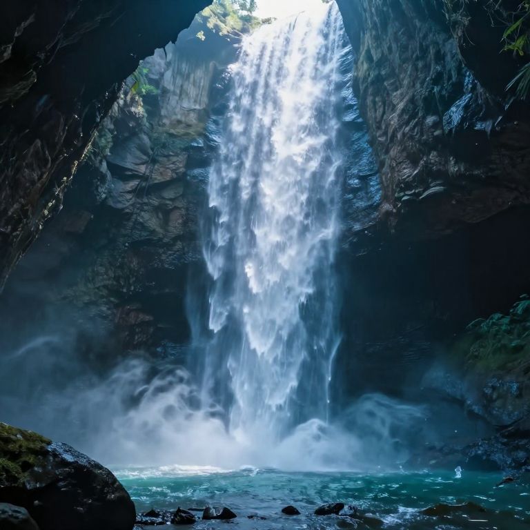 Photograph of a powerful waterfall cascading down a dark, rocky cliffside against a vivid red and white sky, with mist rising from the base.