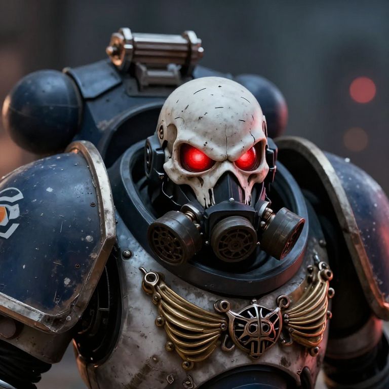 "Biometrics Warhammer 40k, Death Korps of Krieg, glowing red eyes, gas mask with skull design, hyper realistic, extra detailed, 8k, distant image, realistic, HDR, photo real,"