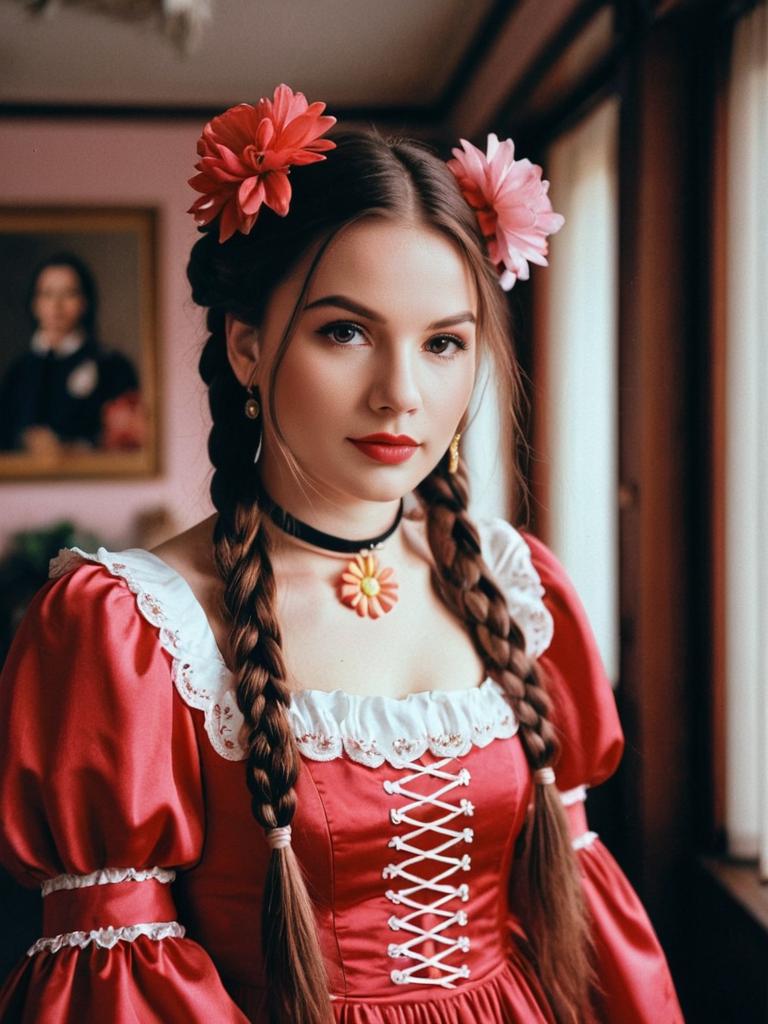 Funny female movie character, dress, 1girl, hair flower, hair ornament, flower, red dress, pink dress, looking at viewer, long hair, solo focus, puffy sleeves, choker, braid, long sleeves, blurry, red flower, twin braids, standing, indoors, brown hair