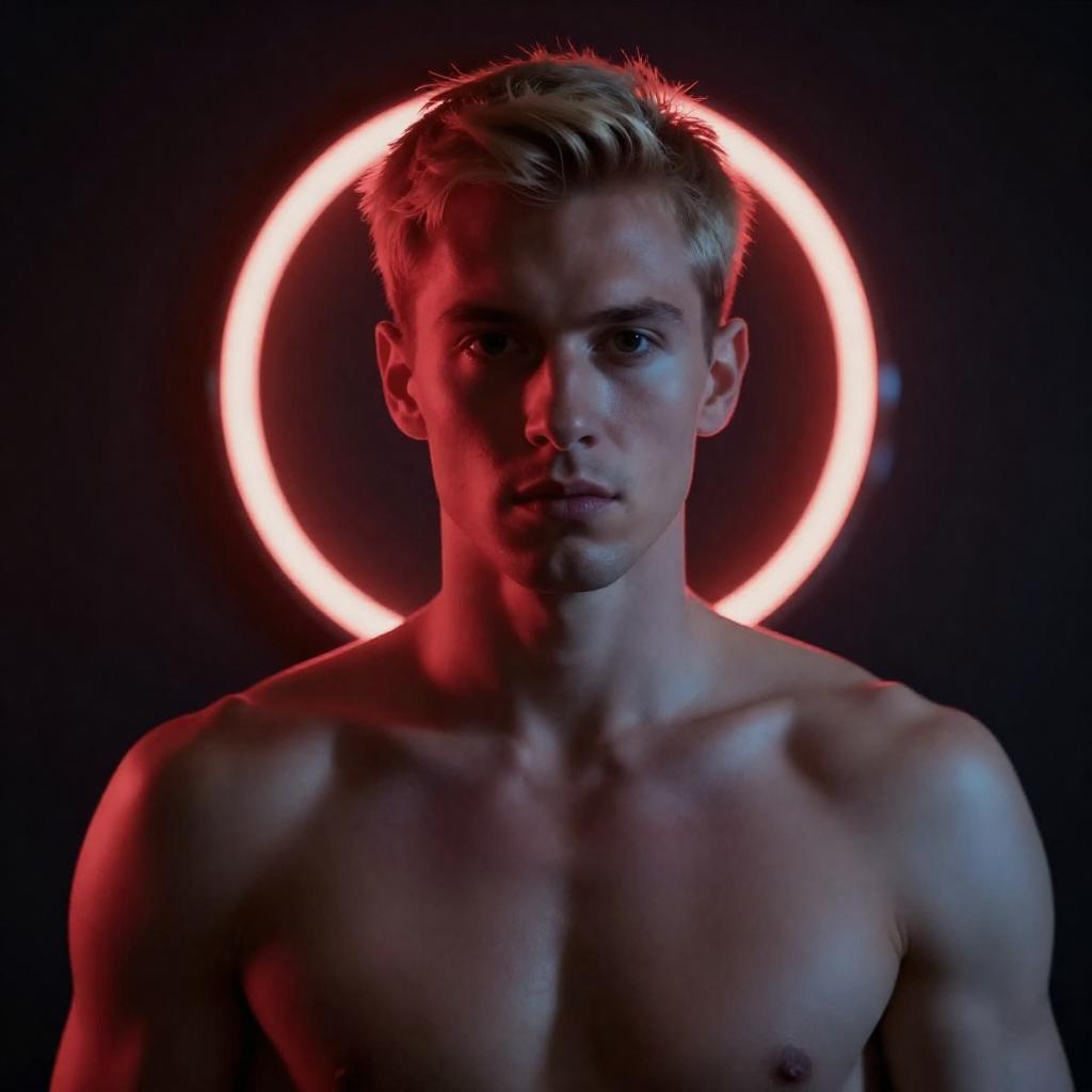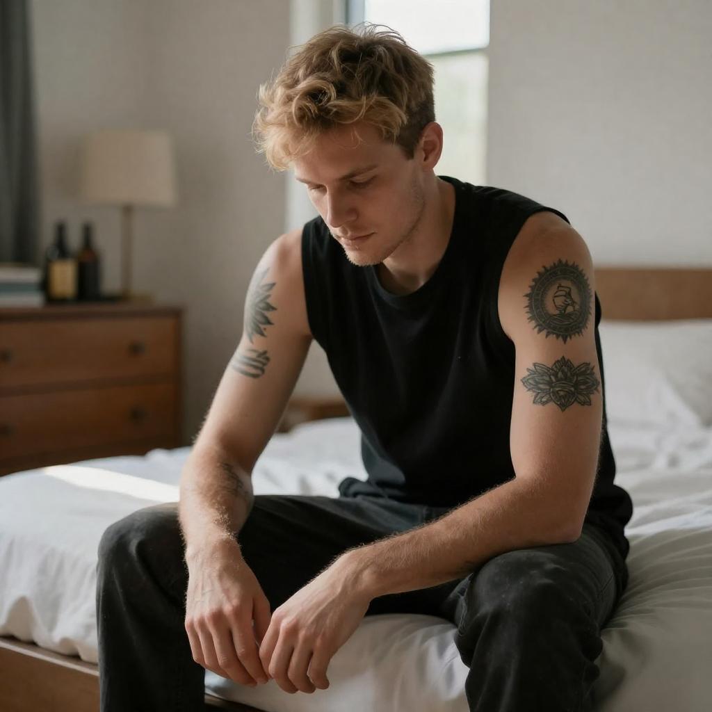 Photograph of a blonde man with short hair, wearing a white t-shirt and black pants, sitting against a red background. His right arm, covered in tattoos, rests on his knee. His expression is intense and focused downward. Red lighting casts a warm glow.
