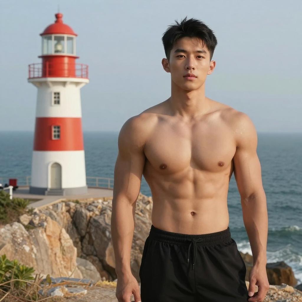 Shirtless East Asian man with wiry build and defined muscle tone standing confidently on a rocky cliff edge near a lighthouse with ocean in the background. Natural lighting highlights his sharp cheekbones and sinewy physique, styled with short side-parted hair. High-detail fashion editorial style portrait.