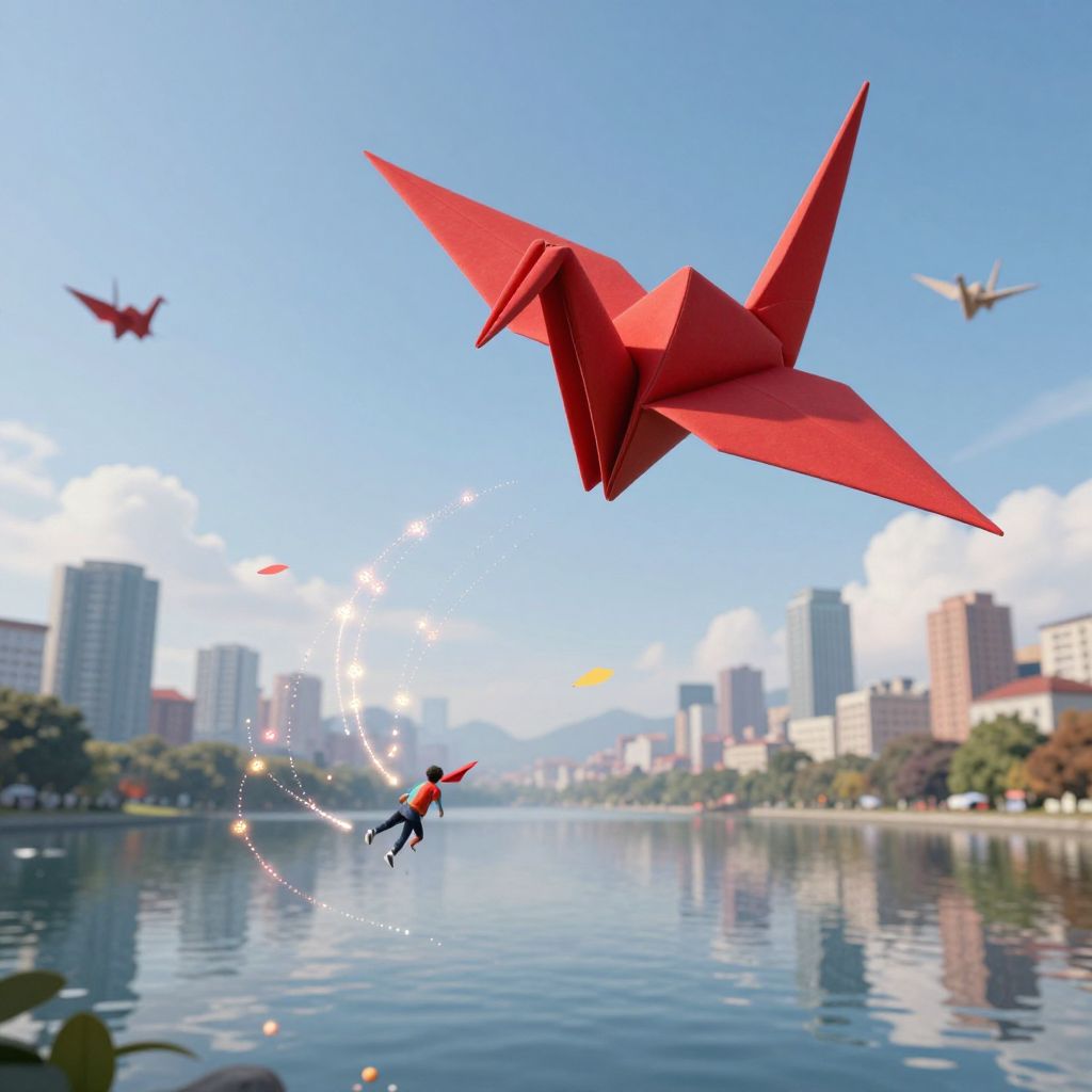Children soar gracefully on giant, crimson origami cranes through a dreamlike cityscape suspended upside-down above a tranquil, mirrored lake, where their flight leaves shimmering trails of glowing paper in the air.
