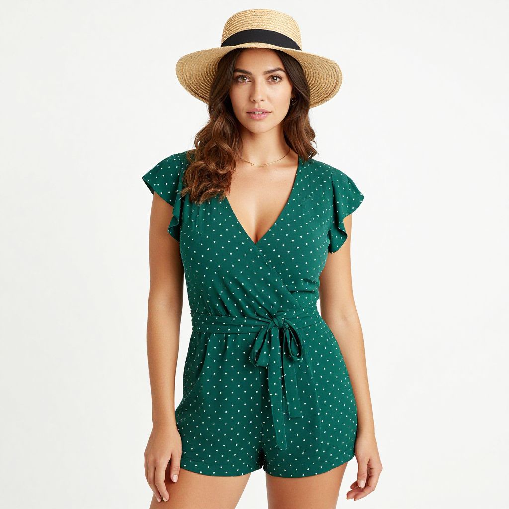 "Woman, summer casual, ruffled dark green romper with small white polka dots, V-neckline, short flutter sleeves, cinched waist with tie belt, thigh-length shorts, straw boater hat with ribbon, white background.. Sexy. Pretty face and beаutiful eyes. Big breasts."